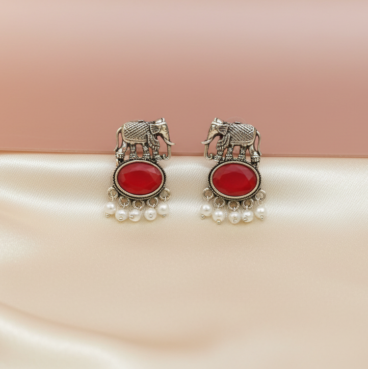 Fancy Oxidised Silver Plated Elephant Shaped Maroon Earring