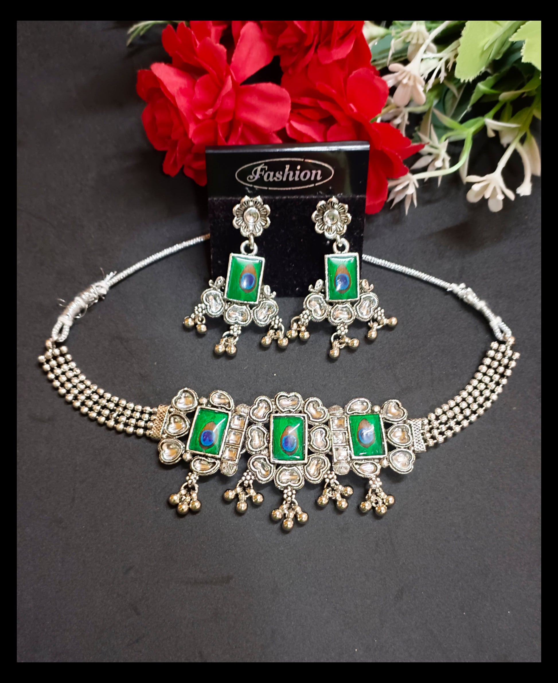 Beautiful Oxidised Silver Plated adjustable Choker Necklace Set (Peacock pattern)